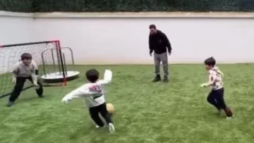 En las stories de Instagram que subió Antonela, se puede ver a Lionel Messi en el patio de su casa en París, jugando un 2 vs 2 con sus hijos. La Pulga juega con Ciro y en frente están Thiago y Mateo, los mayores.