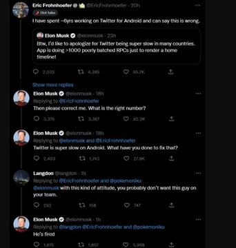 Mientras el hilo generaba todo tipo de reacciones, algunas de apoyo al trabajador y otras pidiendo a Musk que lo echara, Frohnhoefer volvió a tuitear: "Hicimos mucho trabajo para mejorar el desempeño y encontramos que se correlaciona bien con el aumento de UAM y avisos. Estoy de acuerdo, hay mucho espacio aún para mejoras en Android. Sin embargo, no creo que la cantidad de solicitudes sean el asunto primario".
