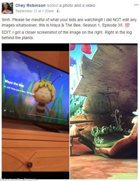 La primera persona en notarlo fue Chey Robinson, una madre de familia en los Estados Unidos. "Por favor, tenga cuidado con lo que nuestros hijos ven en la televisión. No edité ninguna imagen, esta es la Abeja Maya, temporada 1, capítulo 35", escribió en un post de Facebook.
