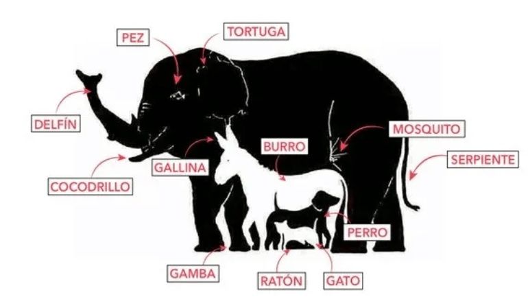 Las siluetas están escondidas dentro de la figura de un elefante. Sí, la primera es evidente pero el desafío está en encontrar el resto de las criaturas.