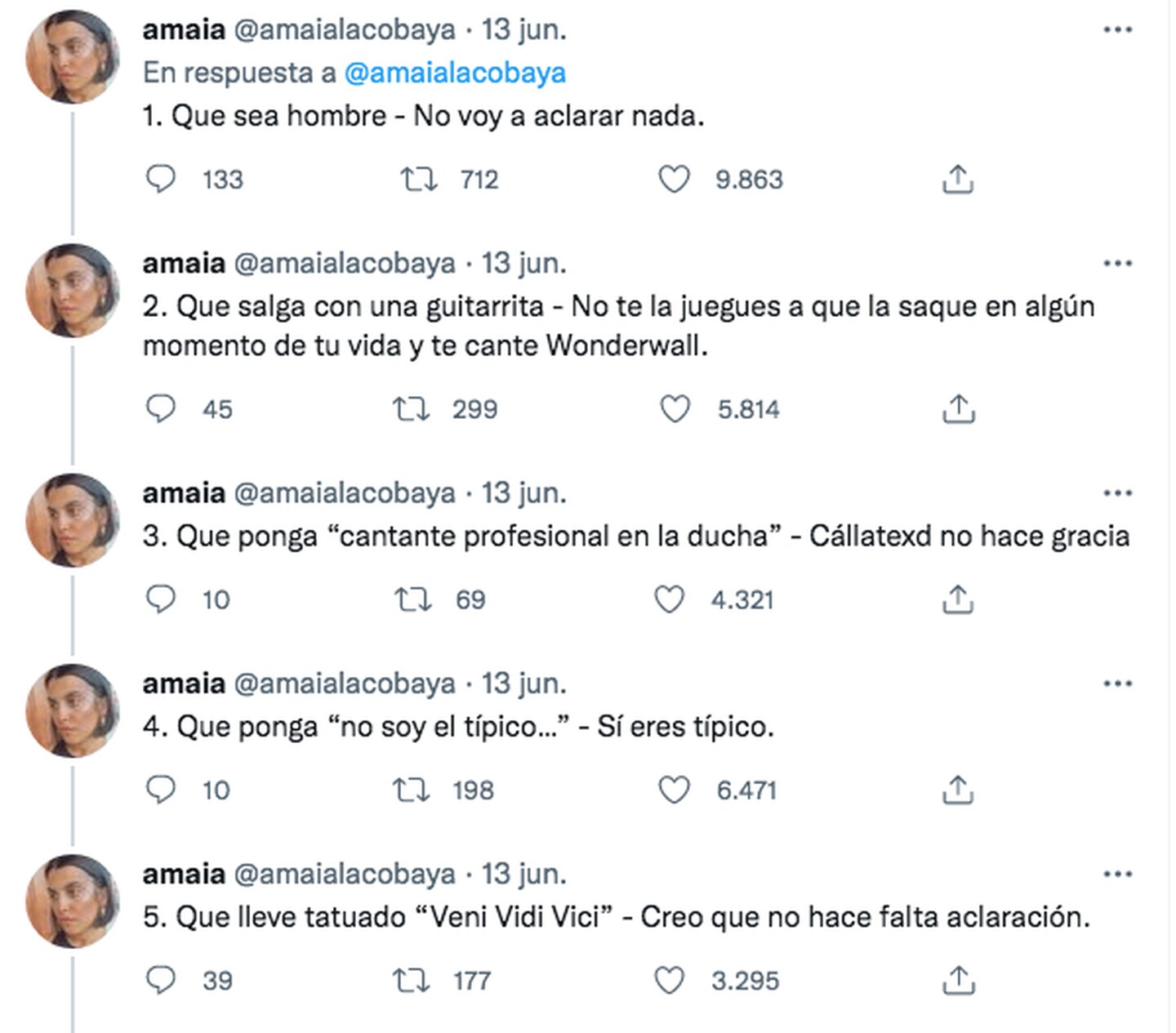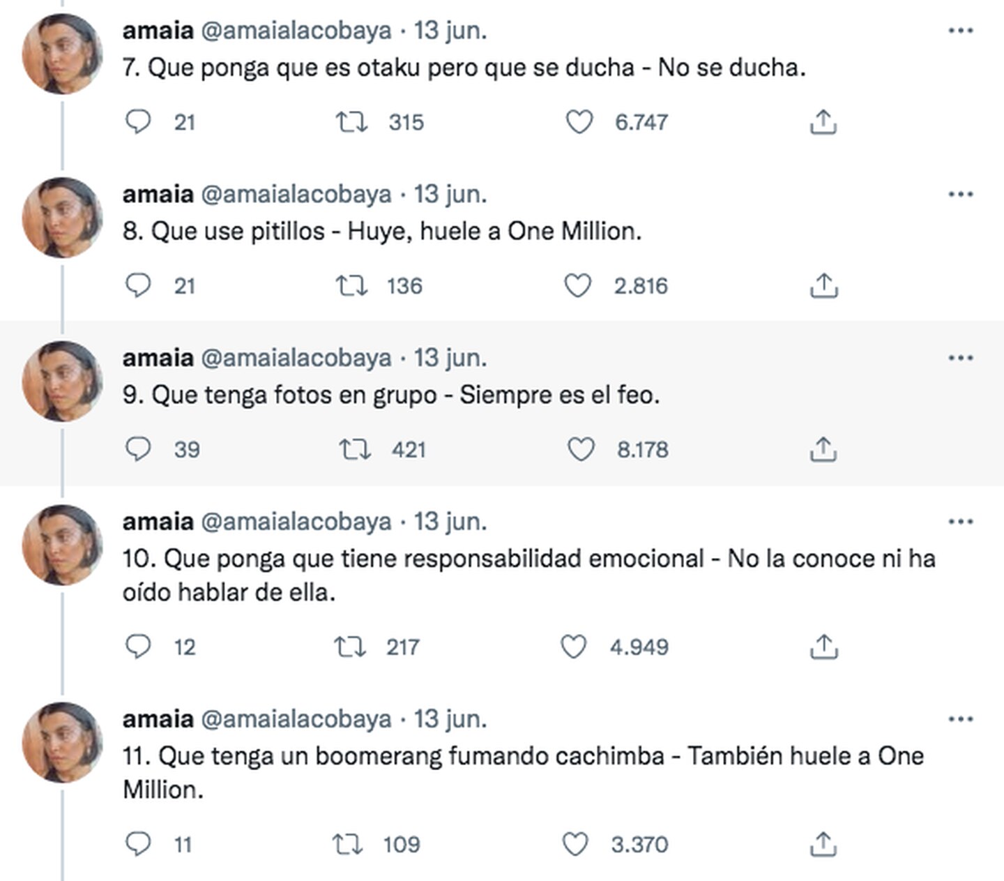Amaia continuó: “4. Que ponga ‘no soy el típico…’ (sí, eres típico). 5. Que lleve tatuado ‘Veni Vidi Vici’ (creo que no hace falta aclaración); 6. Que tengan fotos de algún voluntariado en África (tampoco hace falta aclaración); 7. Que ponga que es otaku pero que se ducha (no se ducha) y 8. Que use pitillos -pantalones achupinados- (huye, huele a One Million)”.