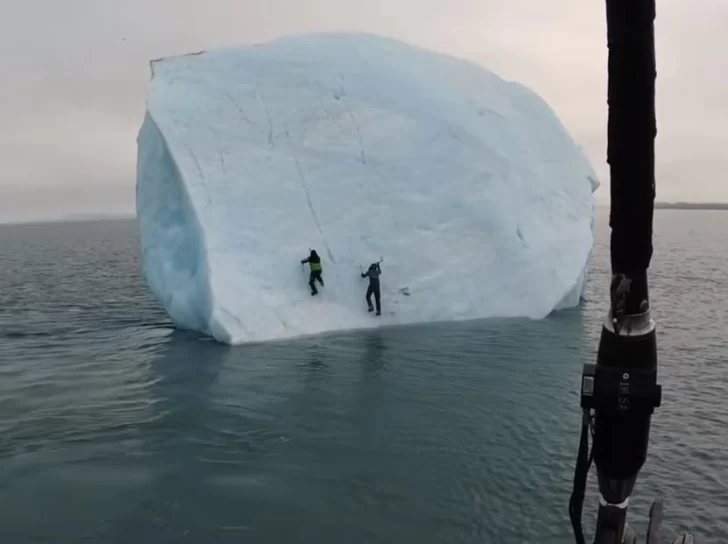 Las imágenes, grabadas desde una pequeña embarcación cercana, muestran a los dos aventureros intentando escalar un bloque de hielo antes de que el islote se vuelque repentinamente.