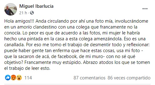 “Hola amigos!!! Anda circulando por ahí una foto mía, involucrándome en un amorío clandestino con una colega que francamente no la conocía. Lo peor es que de acuerdo a las fotos, mi mujer le habría hecho una pintada en la casa a esta colega amenzándola. Eso es una canallada”, denució.