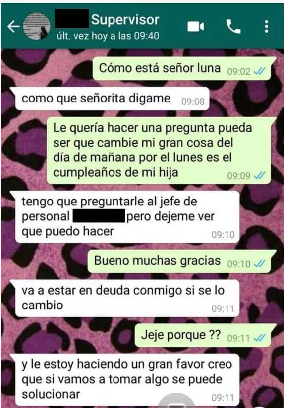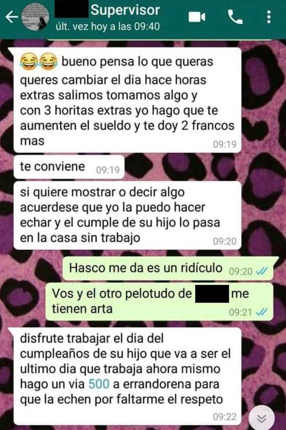La mujer quería estar en la fiesta de cumpleaños de su hija. En el chat, se puede leer como su supervisor accede si, a cambio, ella acepta pasar “horas extra” con él. La sorpresa del primer momento se convirtió en un intento de defensa de la víctima, quien le recordó que solo hablaba de trabajo y después le advirtió que iba a mostrarle sus mensajes a un superior.