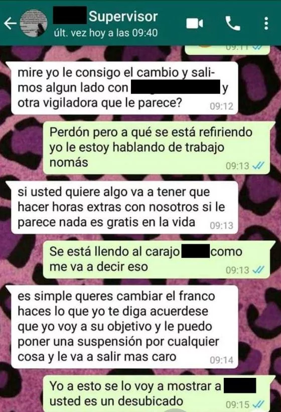 El intercambio de mensajes fue compartido en las redes sociales por un amigo de la supuesta víctima de acoso sexual y en pocos minutos, la indignación se multiplicó. La protagonista es una empleada de una empresa de seguridad de la provincia de Mendozaquien, según el escrache público, sufrió las consecuencias de haberle pedido a su jefe que le autorizara un cambio de turno.
