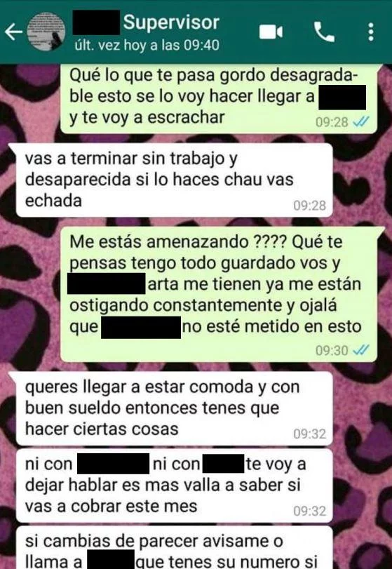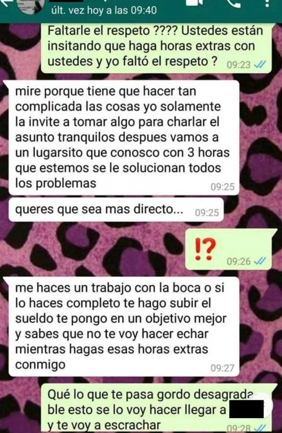 Lejos de amedrentarse, el hombre amenazó con hacerla echar y fue todavía más directo: “Me hacés un trabajo con la boca o si lo hacés completo te hago subir el sueldo, te pongo en un objetivo mejor y sabés que no te voy hacer echar mientras hagas esas horas extras conmigo”, dice el mensaje que publicó el sitio Mendoza Post.