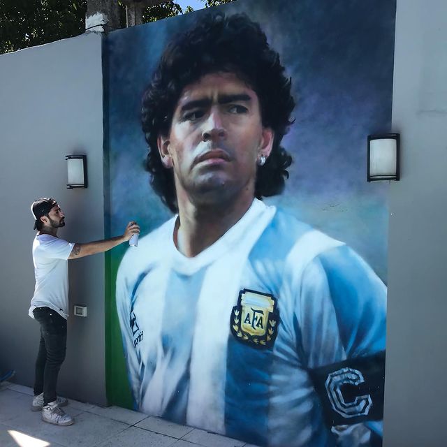 "Cuando era más chico lo dibujé con sus hijas, me fui hasta Avenida Segurola y Habana y pude dárselo a Dalma. Más tarde, como me tocó también pintar su mural en el santuario de Argentinos tuve contacto con Jana y también me llamaron Gianina y Diego Junior. De alguna manera me asociaron con Diego", relató con alegría por su conexión entre sus dos pasiones.