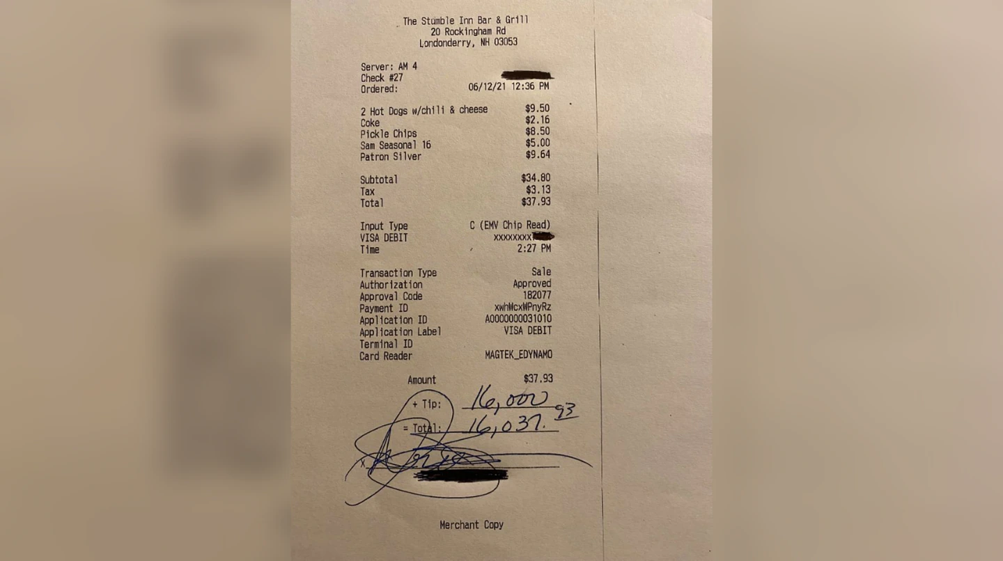 Los empleados de un restaurante de New Hampshire, Estados Unidos, quedaron atónitos luego de que un cliente pidió comida y bebidas por el valor de 37,93 dólares dejó una propina de 16 mil.