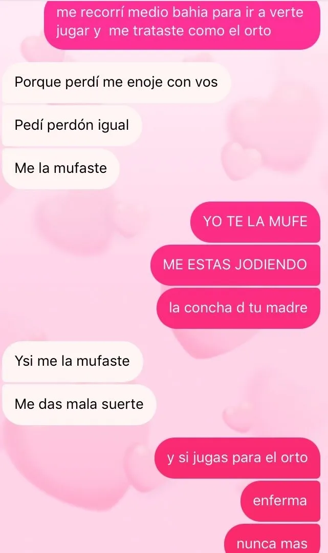 “Me recorrí medio Bahía Blanca para ir a verte jugar y me trataste como el orto”, comenzó “sutilmente” la espectadora del partido. “Porque perdí me enojé con vos. Pedí perdón igual. Me la mufaste”, contraatacó su novia.