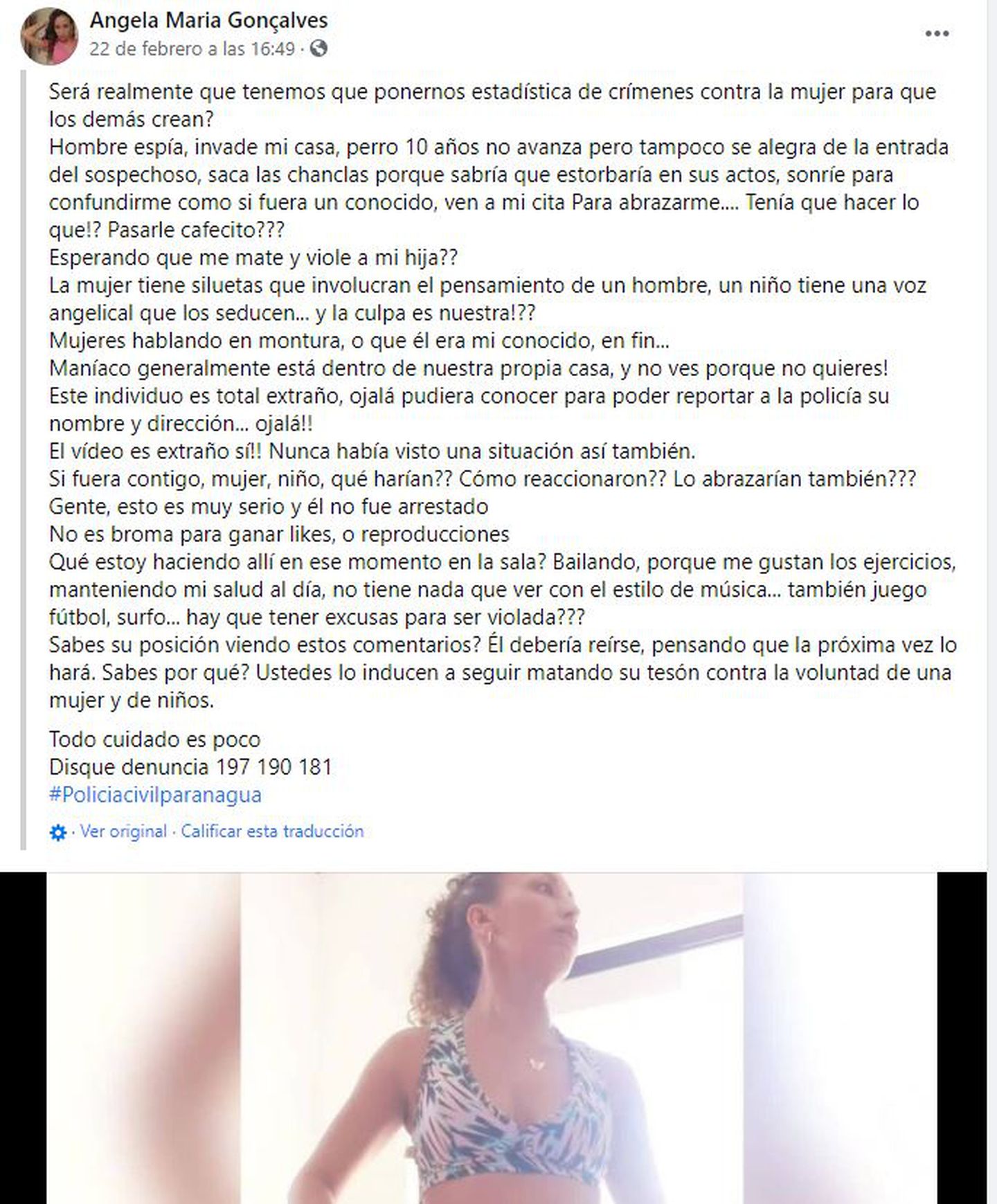También se guardó unas palabras para los que se preguntaban con sarcasmo qué hacía bailando así dentro de su casa, como si con su baile hubiera provocado lo que después ocurrió. “¿Qué estoy haciendo allí en ese momento en la sala? Bailando, porque me gustan los ejercicios. También juego fútbol, hago surf… ¿hay que tener excusas para ser violada?”, concluyó. Goncalves explicó que hizo la denuncia ante las autoridades pero espera que el video genere suficiente repercusión facilitar la identificación del sospechoso.