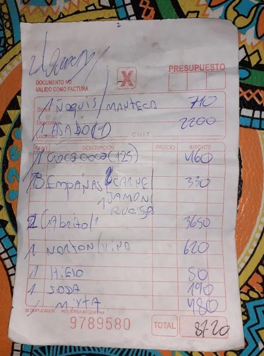 La familia porteña tuvo que pagar: $710 los ñoquis de manteca, $2.200 el asado, $480 una ensalada mixta, $330 las empanadas de carne, $3.650 el cabrito cordobés, $160 la gaseosa, $620 un vino, $190 una soda y $80 el hielo.