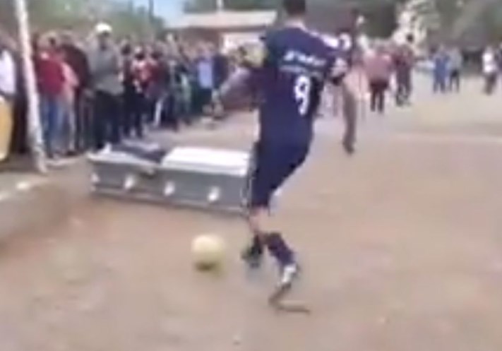 En las imágenes se observa a sus compañeros dando algunos pases hasta que finalmente uno de ellos golpea la pelota contra el ataúd donde se encuentra el cuerpo de Acuña y la pelota termina dentro de la portería.
