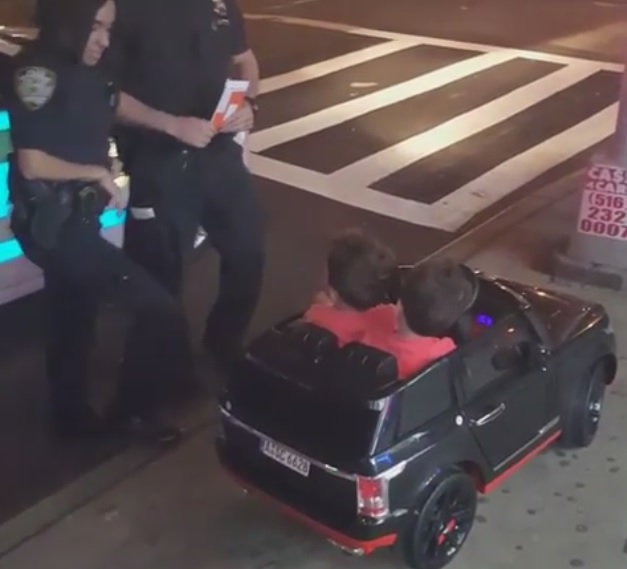 Los gemelos de dos años, Aaron y Evan, aprovecharon las cálidas temperaturas del sábado y salieron a pasear en un diminuto vehículo Range Rover por el vecindario Washington Heights, pero su divertida carrera nocturno se vio interrumpida abruptamente por una patrulla del NYPD.