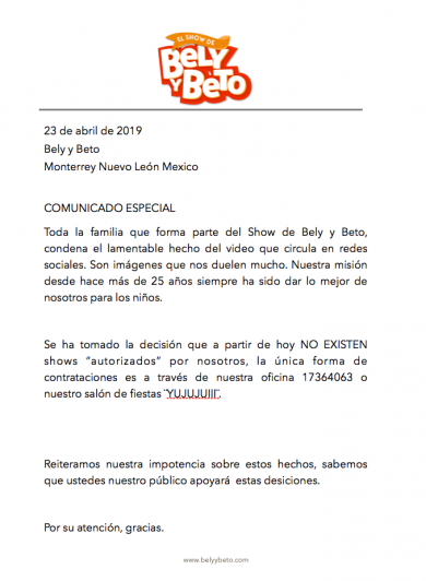 Debido a la gran repercusión que tuvieron las imágenes, la producción de Bely y Beto – el show que imitaba la agresora – envió un comunicado a través de sus propias redes sociales.