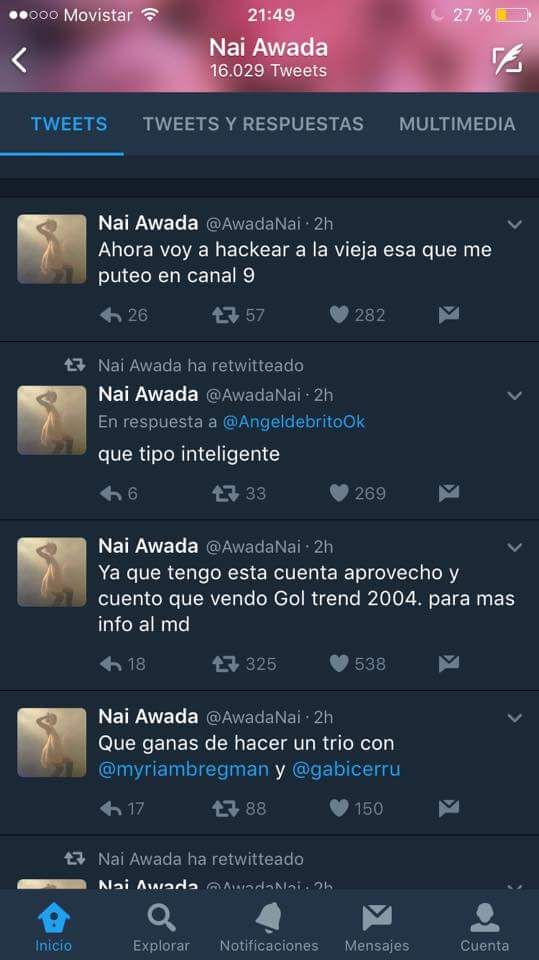Naiara Awada fue víctima del hackeo de su cuenta de Twitter, de usuario @AwadaNai, donde se publicaron una serie de insultos, bromas y contenidos subidos de tono durante la tarde del sábado.