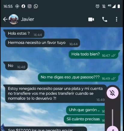 La conversación de WhatsApp se da de manera común y corriente para una estafa. Desde el celular intervenido iniciaron la conversación pidiendo un pequeño favor. El problema que tenía “Javier”, el tío, era que necesitaba transferir una plata, pero su cuenta bancaria no funcionaba bien.