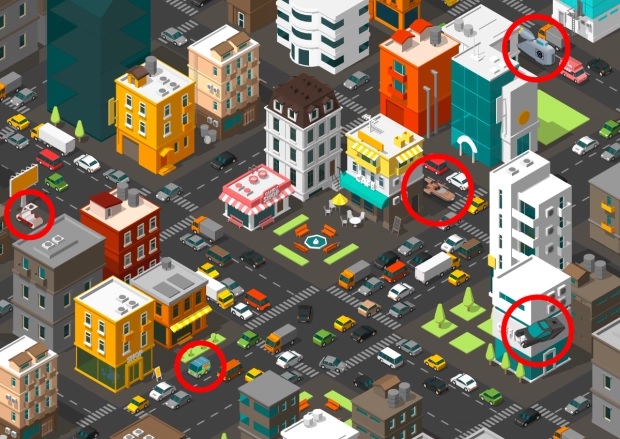La tarea parecería sencilla pero no lo es. Los vehículos están escondidos entre todos los que hay en las calles llenas de tráfico de una ciudad. La camioneta de “Scooby Doo”, el “Batimovil”, el de los “Picapiedras”, “Mi Villano Favorito” y “Star Wars” son los que hay que observar.