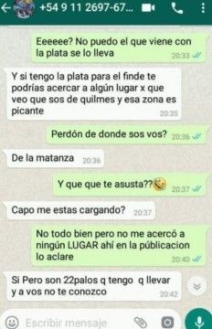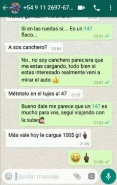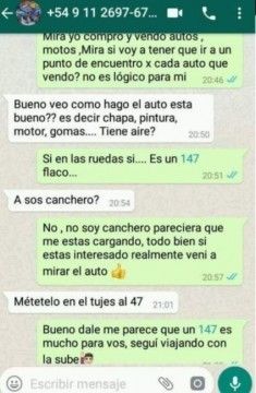 Las pantallas de chats de WhatsApp muestran el ida y vuelta entre un comprador y un vendedor de un 147, pero al “patear” para adelante la compra para juntar el dinero, la charla se pone picante.