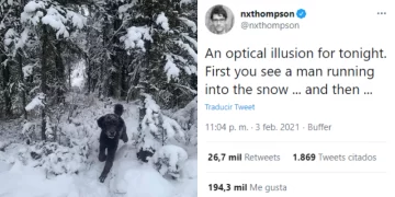 “Una ilusión óptica para hoy. Primero, ves un hombre corriendo en la nieve… Pero, luego…“, escribió Thompson. Con esta imagen, la gente no sabe si se trata de una persona o un perro.