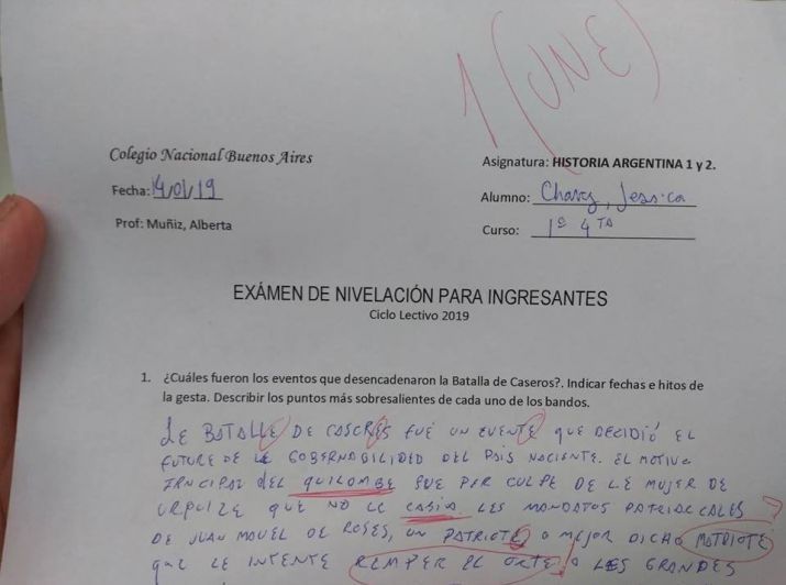 Algunas de las frases que se pueden leer son: “Le batalle de Caseres fue un evente que decidió el future de la gobernabilided del país naciente. El motive principal del quilombe…”, conforme a una pregunta sobre los eventos que desencadenaron la Batalla de Caseros.