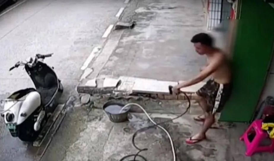 Un joven chino se dispuso para lavar su moto en la vereda en la localidad de Nanning, en China. Al momento de tocar una manguera, recibe una descarga eléctrica que podría haber sido letal, pero finalmente logra desenchufar el aparato eléctrico y salva su vida.