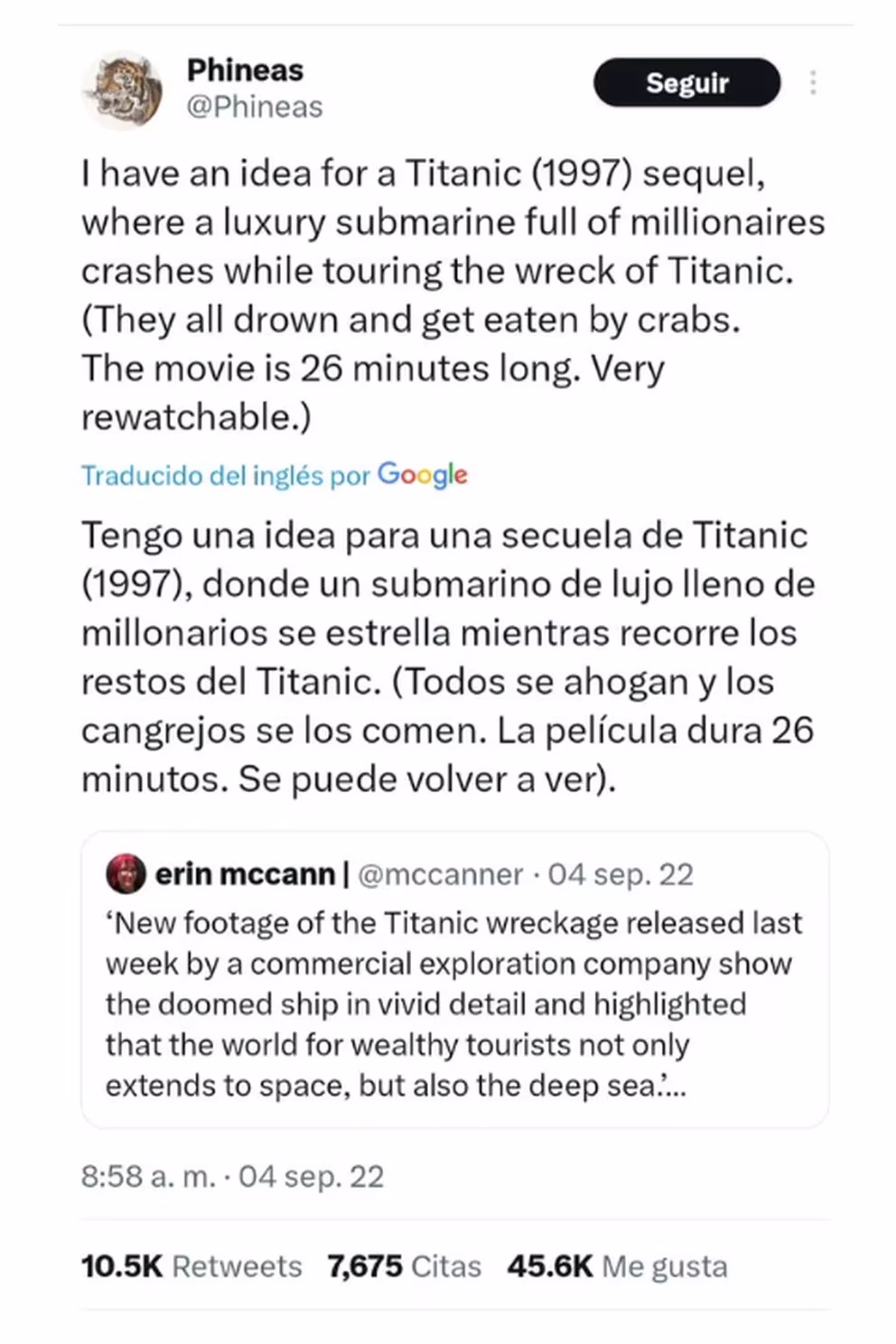 El responsable del tuit viral fue el usuario @phineas que el año pasado se burlaba de una posible secuela de Titanic, la película de James Cameron de 1997, que parecía predecir el trágico destino del sumergible Titan que perdió comunicación con la superficie el pasado domingo y que obligó el despliegue de una operación de búsqueda sin precedentes.