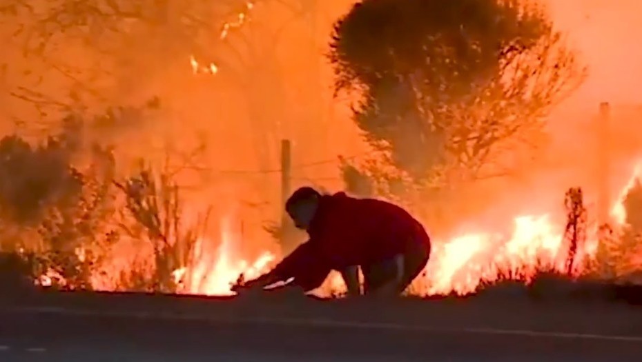 Los gestos del hombre son desesperados. Se agarra la cabeza atormentado, salta, estira los brazos, llamando. Va y viene. El fuego rodea la ruta, en Ventura, California, azotada por incendios feroces. Es de noche. Y todo está registrado en video. La historia empieza así: mientras manejaba lentamente entre el infierno, un joven vio como un conejo cruzaba y se lanzaba a los pastizales ardientes al costado del camino.
