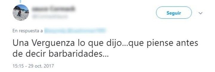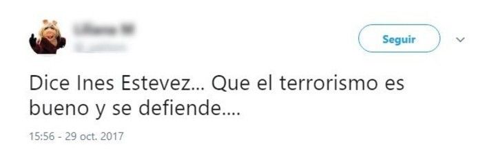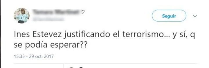 "Inés Estévez justificando un acto terrorista por el simple hecho de que ‘el otro empezó’. La cabeza quemada. #Mesaza", "Una vergüenza lo que dijo… que piense antes de decir barbaridades", "Justifica a Isis y el terrorismo Yihadista??… supongo que luego no saldrá colgándose un cartelito de #NiUnaMenos", "Dice que el terrorismo es bueno y se defiende…", "Justificando el terrorismo… y sí, qué se podía esperar??", y "Del ‘pero y quién empezó?’ de Inés Estévez después que RÍgoli hablara de los terroristas poniendo bombas en un estadio, no se vuelve", fueron sólo algunos de los mensajes en contra de la actriz.