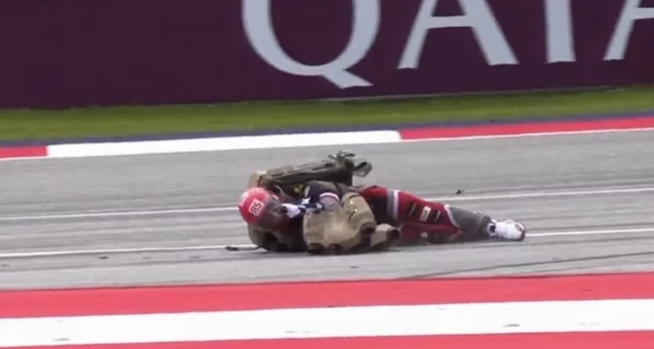Si bien por fortuna estaba cerca del piso, el showman no pudo evitar sufrir una aparatosa caída sobre la pista austríaca que impresionó a más de uno. A pesar del susto, el piloto pudo abandonar la zona por sus propios medios aunque con gestos de dolor en su pierna.