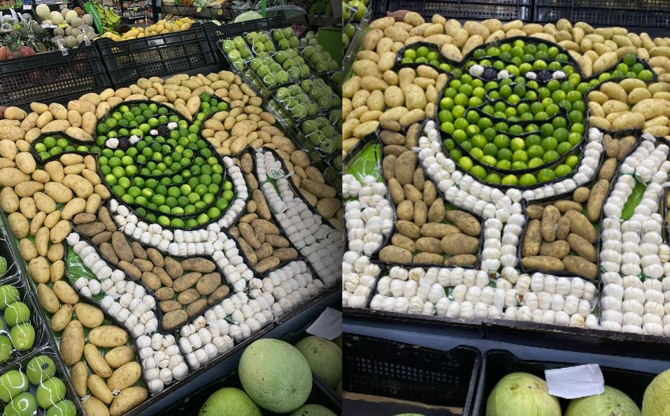 Con ajos, papas y limones, empleados de un supermercado sacaron a relucir su creatividad y crearon un mural de Shrek, con el objetivo de impulsar las ventas y hacer pasar un rato agradable a los clientes.
