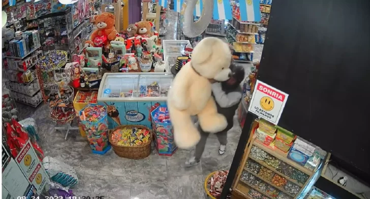 El insólito robo ocurrió este jueves a las 19.30 en un kiosco ubicado en la esquina de Avenida Avellaneda y Aguilar de Olavarría. Un hombre ingresó al local con un casco de moto, tomó un oso de peluche de 1,70 metros de alto y se fue.