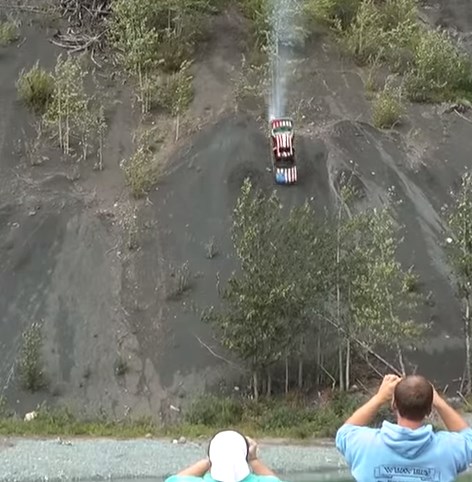 Es por eso que en Glacier View, en donde a esta altura del año el sol se pone a las 11 de la noche y amanece a las 4.30, encontraron una manera muy particular de festejar: lanzan autos y camionetas desde un precipicio.