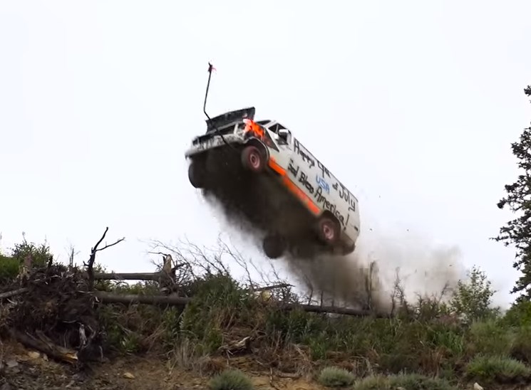 Los organizadores usan un método bastante rudimentario pero efectivo: traban la dirección y ponen un tronco sobre el acelerador para enviar el vehículo hacia una pequeña rampa de tierra que lo hará despegar hacia el vacío.