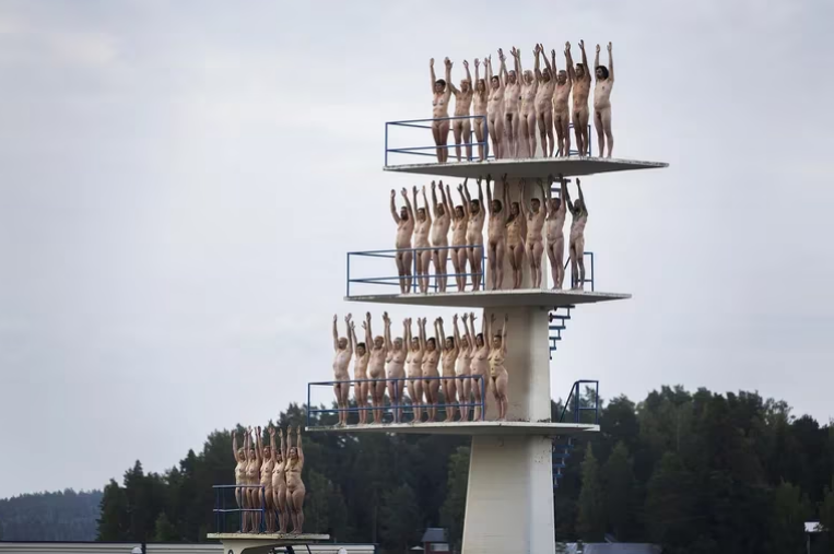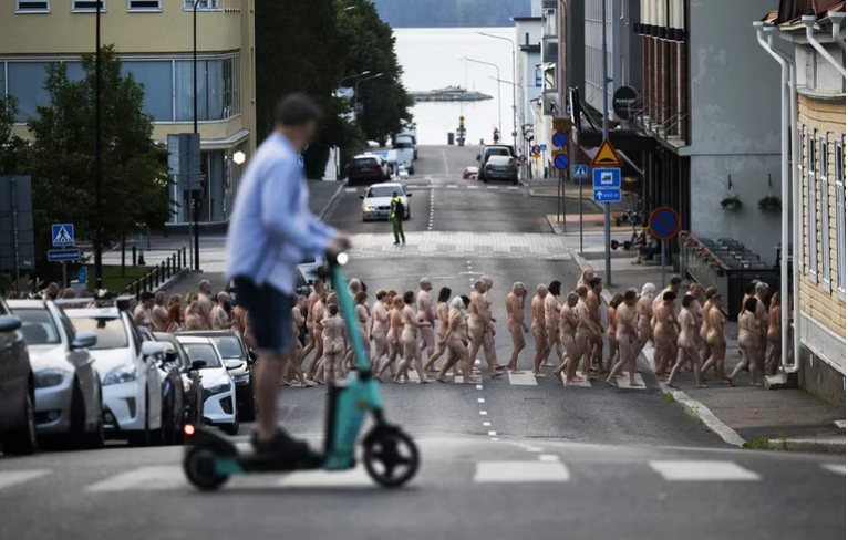 “Hoy, la tierra de los mil lagos, se convirtió en el país de los mil desnudos”, dijo a la Tunick, mientras que los voluntarios eran guiados por altavoz. Los participantes posaron primero en la calle, alrededor de instalaciones florecidas, luego en la playa y finalmente en el agua.