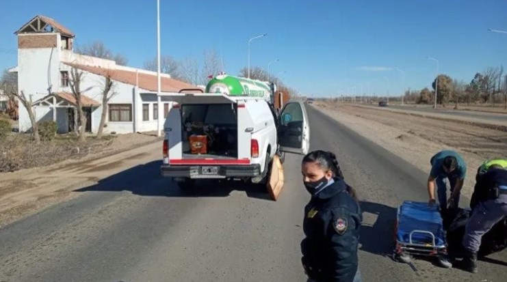 En las fotos se alcanza a apreciar una camioneta de caja cubierta con la puerta trasera abierta, la parte de abajo del cajón por un lado, a unos metros la tapa y más allá, el cuerpo del fallecido en la cinta asfáltica.