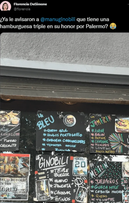 El deportista se enteró de su existencia debido a que una usuaria de Twitter llamada Florencia DeSimone, publicó en su cuenta personal "florencia" una foto en la que se puede observar los ingredientes. ¿Ya le avisaron a Manu Ginóbili que tiene una hamburguesa en su honor en Palermo?", escribió en la descripción. Él no estuvo de acuerdo con uno de los ingredientes y por eso decidió expresarse a través de un comentario.