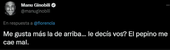 Al poco tiempo de la publicación del tuit, el exjugador de básquet escribió qué pensaba de la hamburguesa. "Me gusta más la de arriba… ¿le decís vos? El pepino me cae mal", indicó. Florencia le respondió al instante: "Les voy a mostrar tu respuesta para que la cambien".