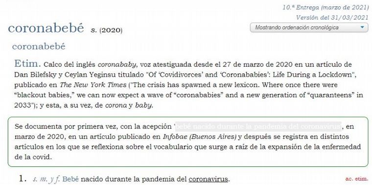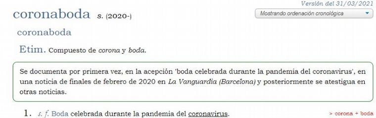 Forma parte de un listado de nuevos términos que la Real Academia Española añadió a su diccionario de términos. "Coronaboda" y "coronabebé" son otras de las nuevas expresiones adheridas.