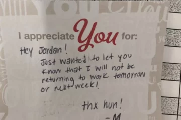 En la esquela se podían leer las palabras de la mujer, escritas a mano, que decía: "¡Hey, Jordan! Solo te quería decir que no voy a volver a trabajar mañana, ni la semana que viene. ¡Gracias cariño!".