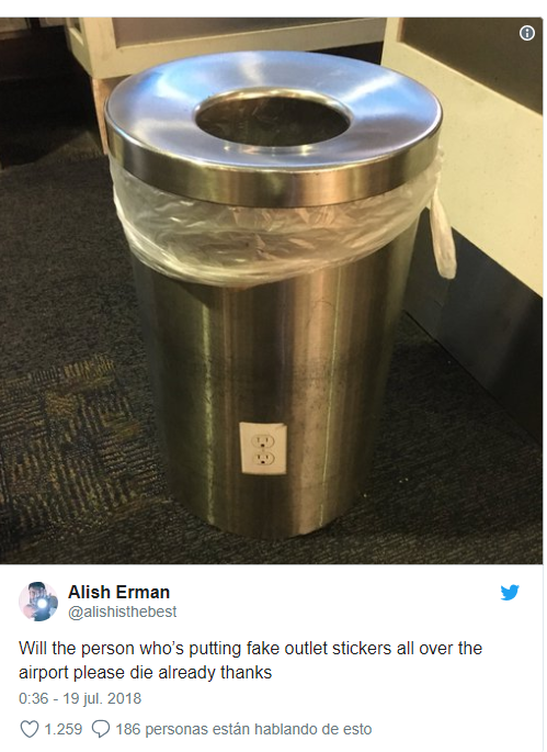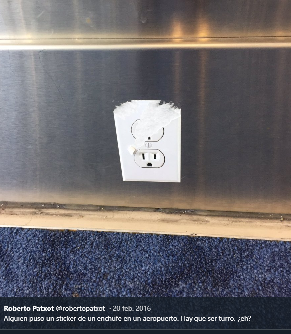 Estas pegatinas están tan bien hechas que incluso simulan la sombra de los bordes del enchufe, para parecer más real. Más allá de la broma, el choque con la realidad de un enchufe falso puede hacernos reflexionar sobre la constante dependencia de los usuarios hacia los artículos electrónicos. ¿Qué pasa si no cargo mi laptop? probablemente no cambie nada. Sin embargo, en Twitter se han multiplicado las fotos de usuarios en el aeropuerto con comentarios indignados por la broma: