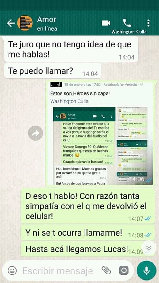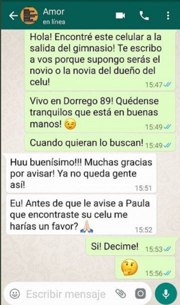 En las últimas horas se viralizaron una serie de capturas de lo que parece ser la conversación entre un chico que encontró un celular a la salida de un gimnasio y el novio de quien perdió el teléfono.
