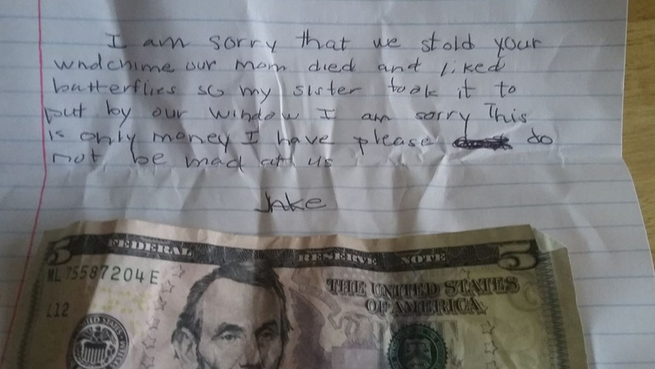 "Lamento que hayamos robado sus campanas de viento. Nuestra madre murió y le gustaban las mariposas. Por eso, mi hermana las tomó y las puso en nuestra ventana. Lo siento. Este es el único dinero que tengo. Por favor, no se enoje. Jake". Ahora, Chrissy busca al niño y asegura que no quiere castigarlo sino darle un regalo.