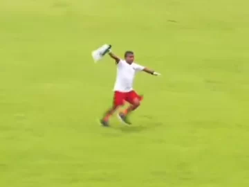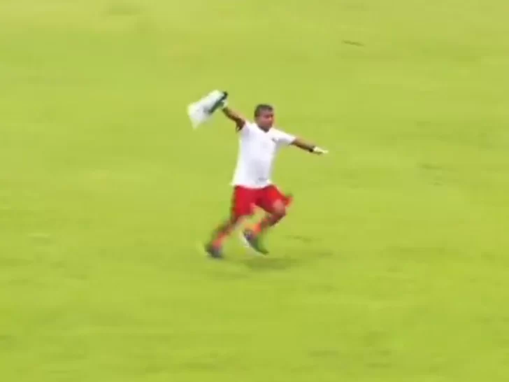 Lo llamativo fue la forma en la que el masajista ingresó al campo: lo hizo con ambos brazos estirados y moviéndose de un lado a otro, como si fuese un avión. De inmediato, llegó a donde estaba ubicado el jugador y lo atendió.