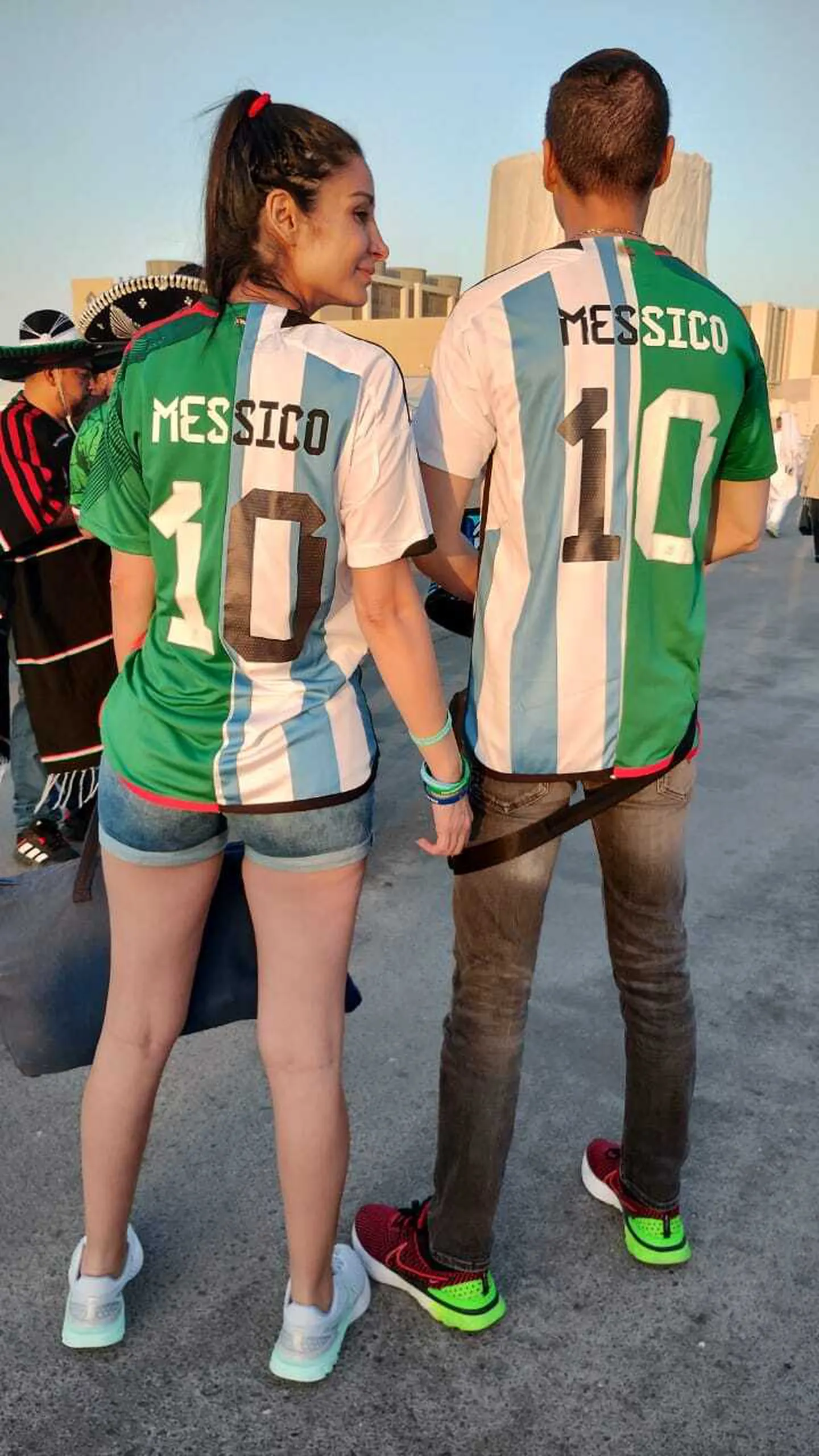 En el ingreso, TN se encontró con Diana y Manuel, una pareja de mexicanos fanáticos de Lionel Messi. Ellos decidieron hacerse una camiseta con la leyenda que combina sus dos pasiones y que es perfecta para alentar a su país y al capitán argentino al mismo tiempo: “Messico”.