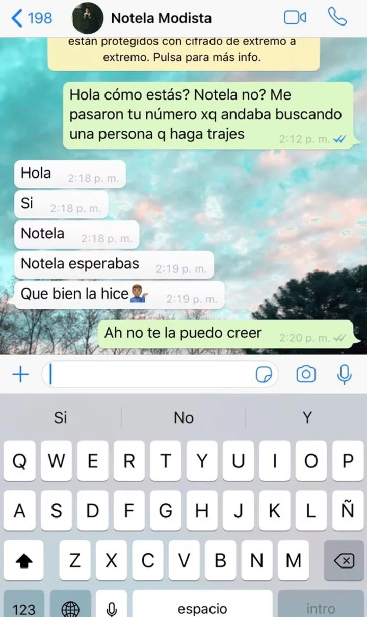Pasaron unos minutos y, para su sorpresa, le llegó un mensaje de WhatsApp, era de un número desconocido y decía: "Hola, ¿cómo estás? Notela ¿no? Me pasaron tu número porque andaba buscando una persona que haga trajes". El truco había funcionado a la perfección.
