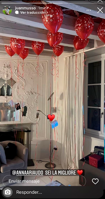 El arquero de la Selección Argentina, Juan Musso, regresó a su casa en Bérgamo y su mujer lo esperaba con una sorpresa. El techo de su living estaba lleno de globos rellenos de helio con la leyenda "Ti amo".