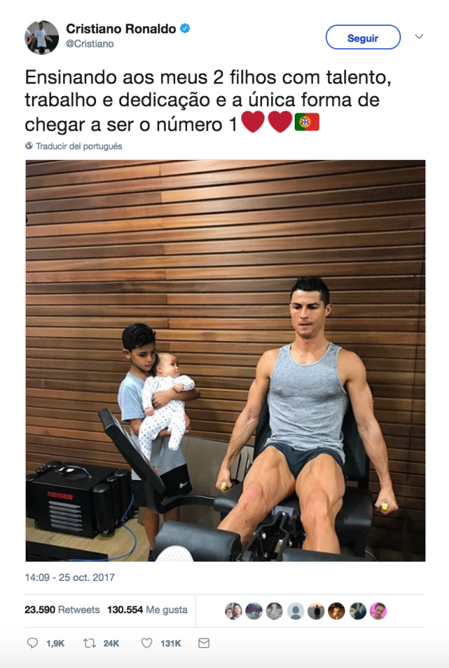 Cristiano Ronaldo subió una fotografía que rápidamente viralizó. En ella comparte el secreto de su éxito profesional. El título de la foto dice: “Enseñando a mis dos hijos. Con talento, trabajo y dedicación es la única manera de llegar a ser el número uno”.