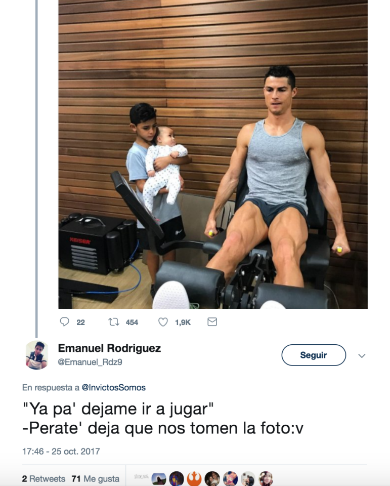 En la fotografía el primogénito de Ronaldo ejerce con ternura su rol de hermano mayor, cargando al bebé Mateo en sus brazos, mostrándole cómo su padre entrena intensamente.