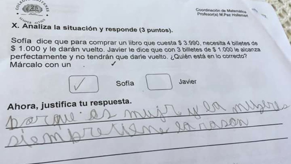 La curiosa respuesta del alumno fue: “Sofia” y agregó: “Porque es mujer y la (sic) mujeres siempre tienen la rason (sic)”. El posteo original fue compartido más de 8 mil veces en Facebook.