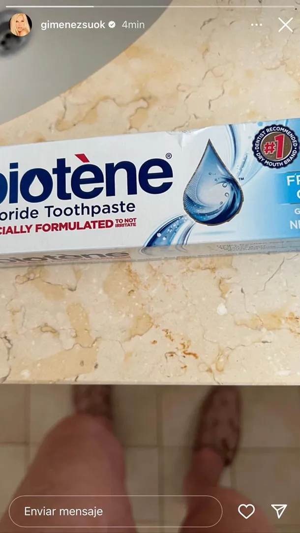 Ahora desde Punta del Este, la diva de los teléfonos volvió a tener un descuido. En este caso, publicó una curiosa foto de una pasta dental, en donde se observan sus piernas de fondo. Al rato la eliminó.